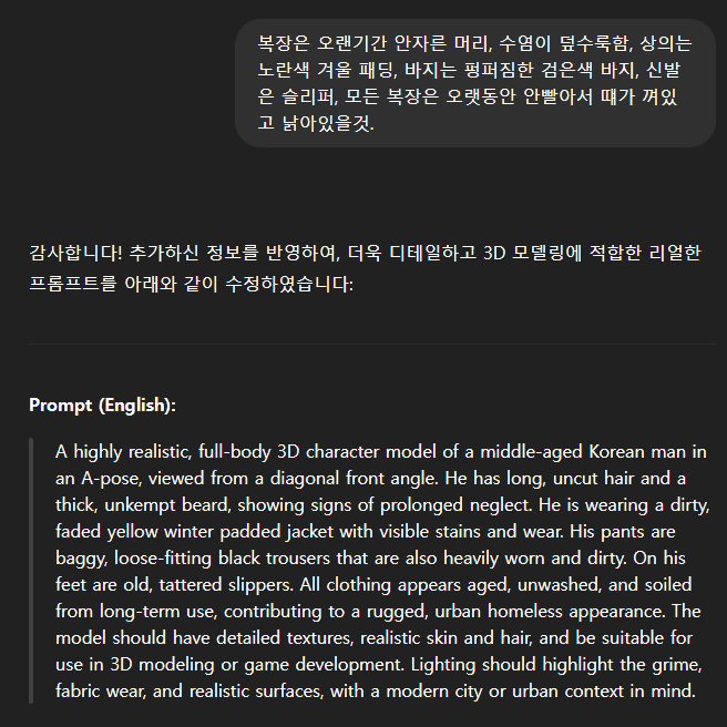 그리고 이것을 그대로 복사한 뒤 결과에서 마음에 들지 않는 부분을 다른 프롬프트로 작성했습니다.