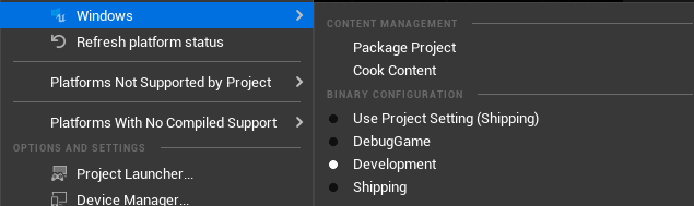 Build Configuration은 Development, Shipping 등 어떤 상태로 빌드를 할지 정하는 환경설정이다.